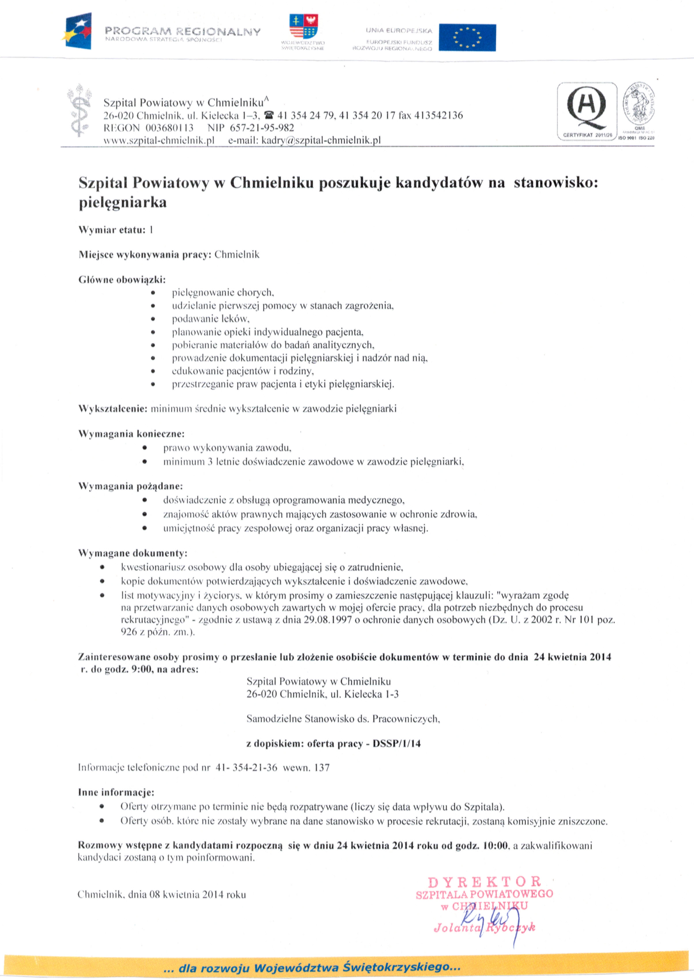 Szpital Powiatowy w Chmielniku poszukuje kandydatów na stanowisko: pielęgniarka